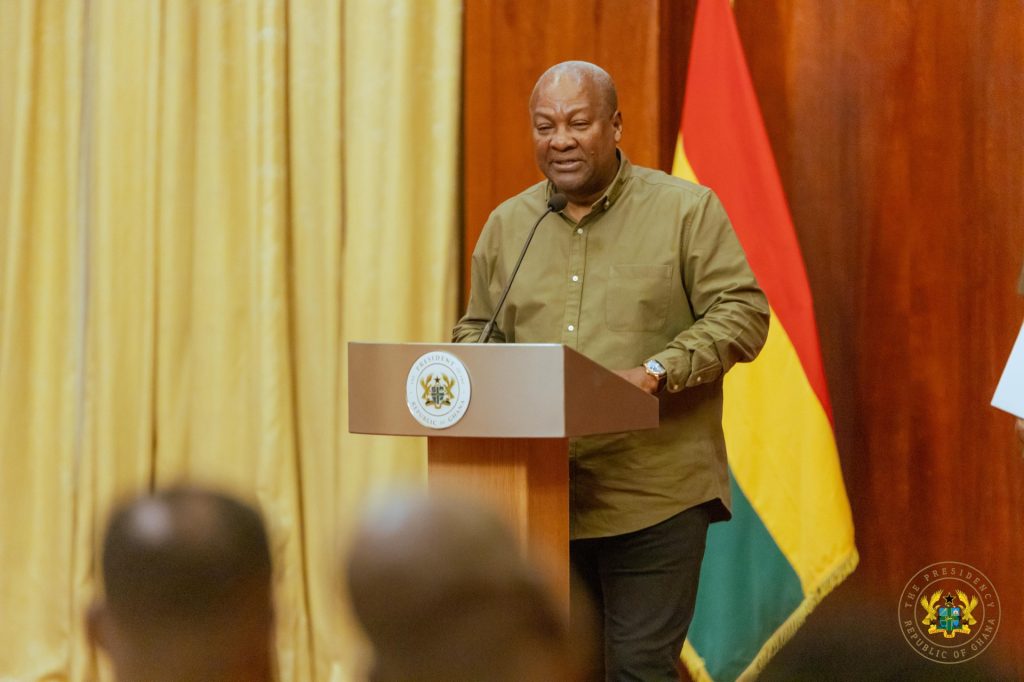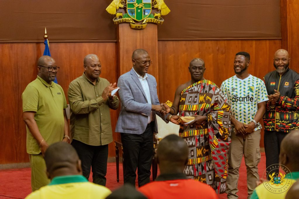 President John Dramani Mahama on Saturday presented $50,000.00 cheque each to Ghana’s Premier League Champions Bibiani Gold Stars and MTN FA Cup holders Asante Kotoko at the Presidency in Accra.