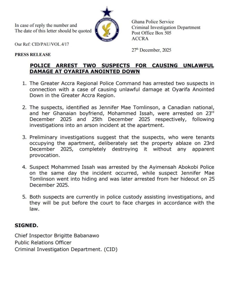 Issah was arrested by the Ayimensah Abokobi Police on the day of the fire. Tomlinson, who allegedly went into hiding, was subsequently apprehended on Christmas Day, December 25.