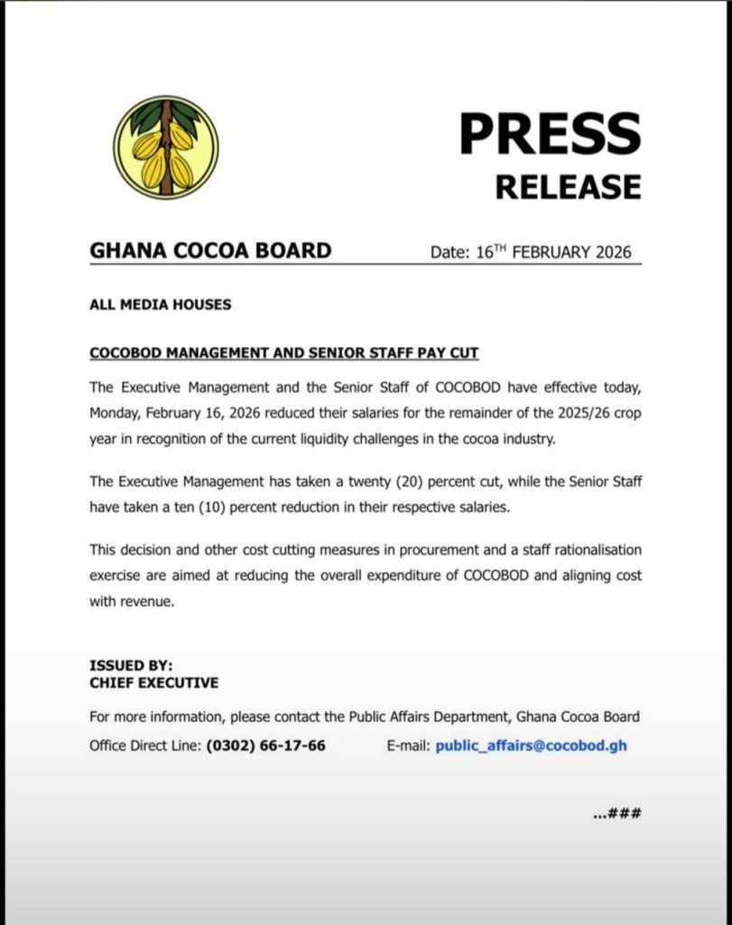 Ghana Cocoa Board (COCOBOD) has implemented immediate salary reductions for its executive management and senior staff in a decisive move to navigate the ongoing liquidity constraints plaguing the cocoa industry.