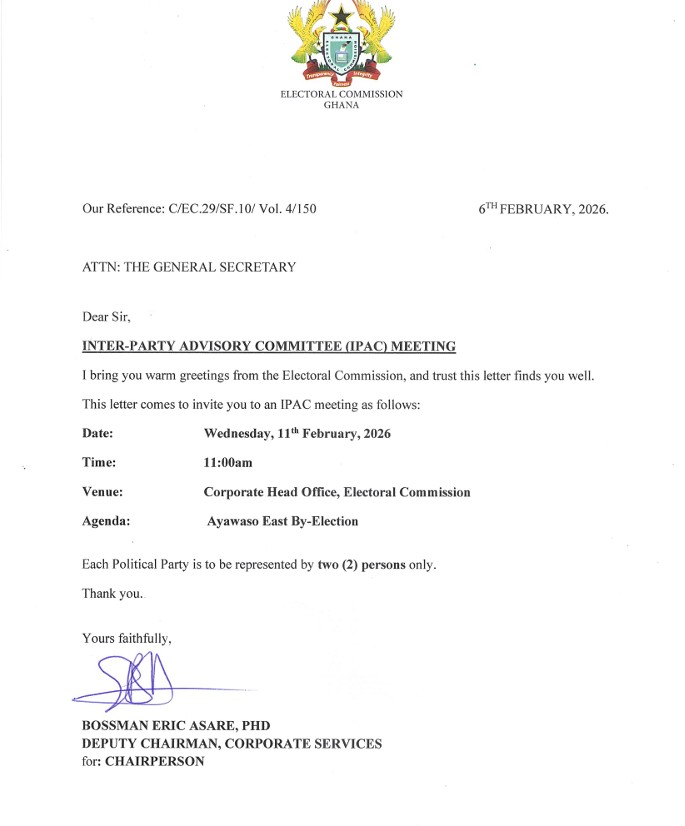 The Electoral Commission (EC) has summoned an Inter-Party Advisory Committee (IPAC) meeting for Wednesday, February 11, 2026, to deliberate on preparations for the upcoming Ayawaso East parliamentary by-election.