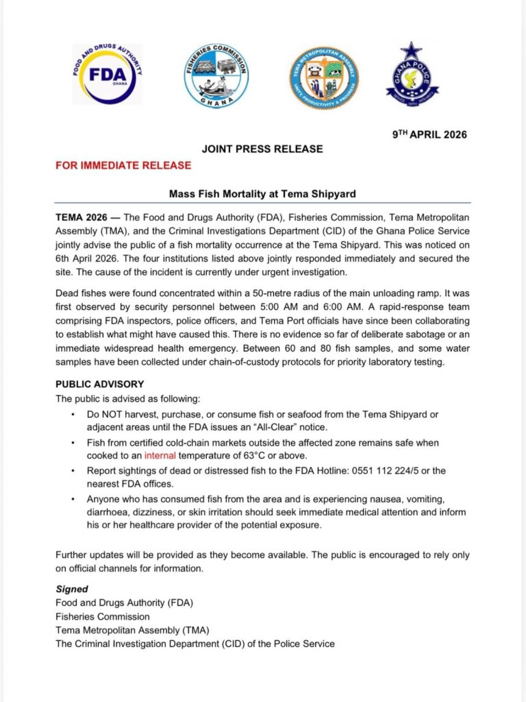 Authorities have warned the public against harvesting, purchasing, or consuming any fish or seafood from the Tema Shipyard or its surrounding waters until further notice.