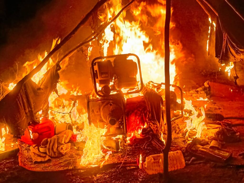 District Manager Joe Appiah Frimpong reported the discovery and destruction of four active mining camps, complete with changfang machines and tools, which were subsequently incinerated.