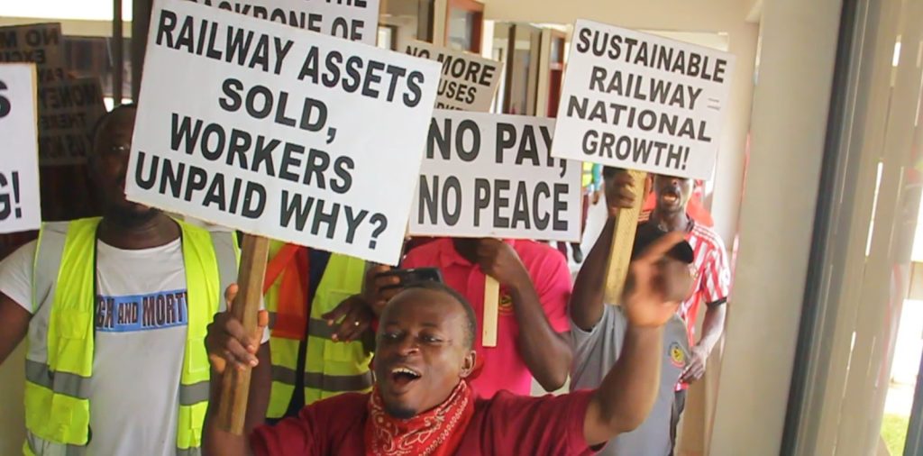 Displaying their grievances on placards, the angry staff accused the Ministry of foot-dragging regarding the disbursement of GH¢20.6 million funds accrued from the sale of obsolete railway materials.