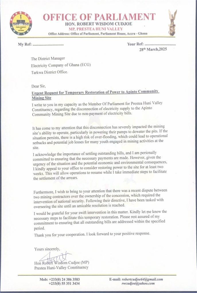ECG’s initial disconnection triggered political intervention. The MP for Prestea Huni Valley, Robert Wisdom Cudjoe, wrote to ECG on March 28, 2025, requesting reconnection of power.