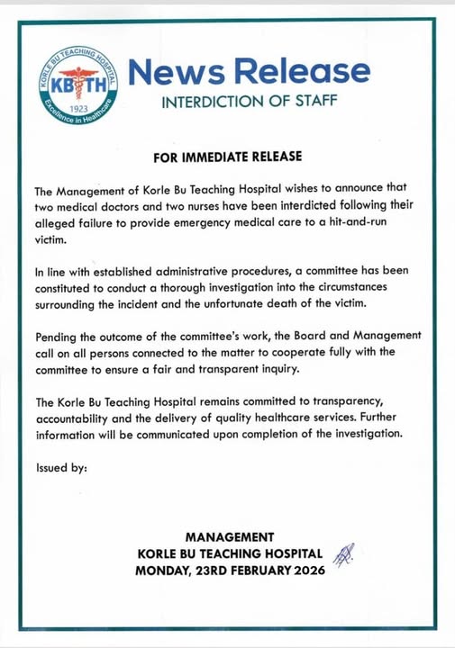 The management of Korle Bu Teaching Hospital has interdicted two doctors and two nurses over their alleged refusal to treat a 29-year-old engineer who later died at the facility.