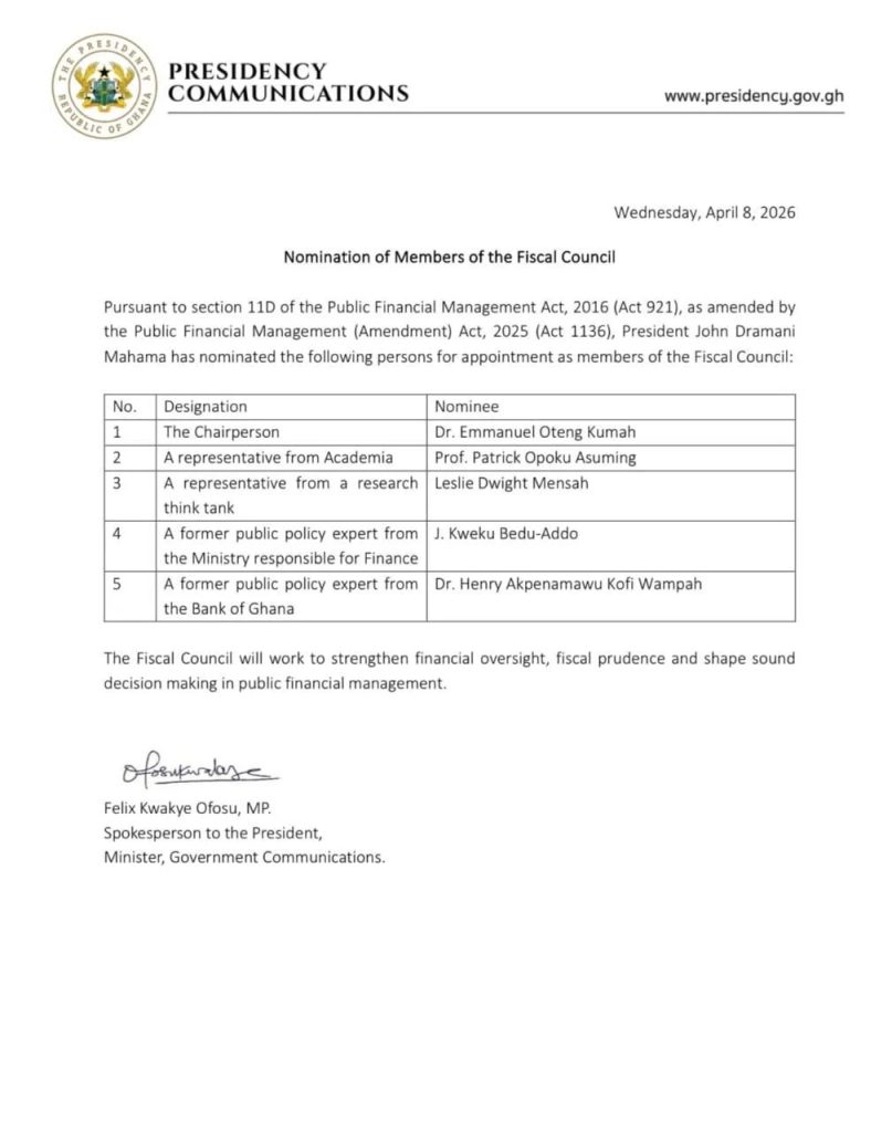 President John Dramani Mahama has nominated five individuals for appointment to the Fiscal Council, in accordance with the Public Financial Management (Amendment) Act, 2025 (Act 1136).