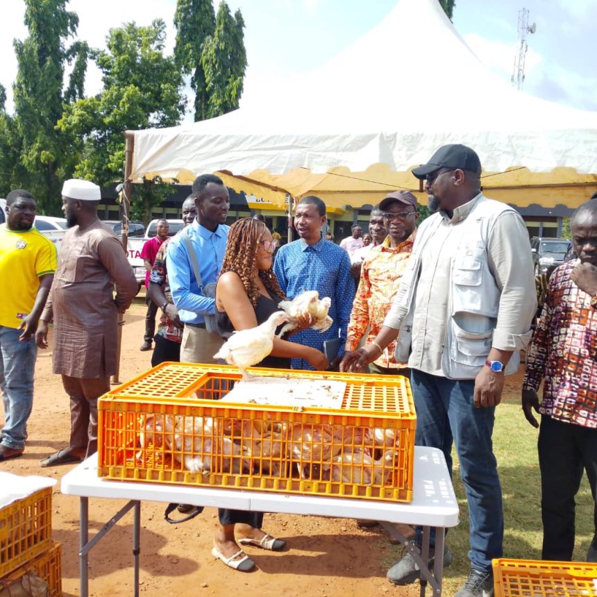 Mr John Dumelo, the Deputy Minister of Food and Agriculture has presented 110,000 birds to be distributed to farmers under the government flagship ‘Nkoko Nketenkete’ initiative in the Bono East Region.