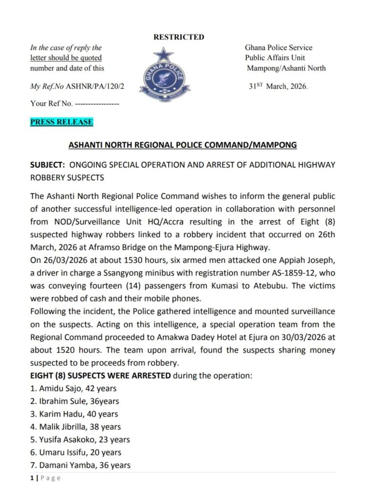 The initial robbery occurred on March 26, 2026, at about 3:30 pm at Aframso Bridge along the Mampong-Ejura road.
