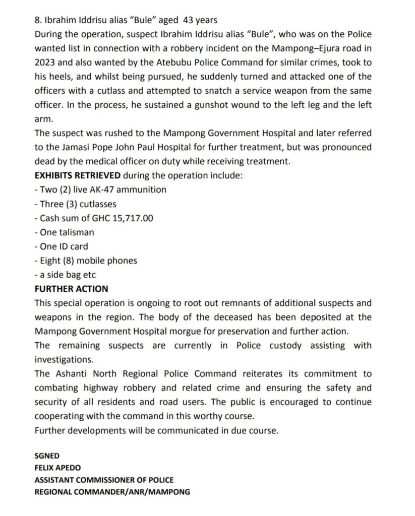 Police said he had been on their wanted list since 2023 in connection with a previous robbery on the same road, and was also wanted by the Atebubu Police Command for related offences.