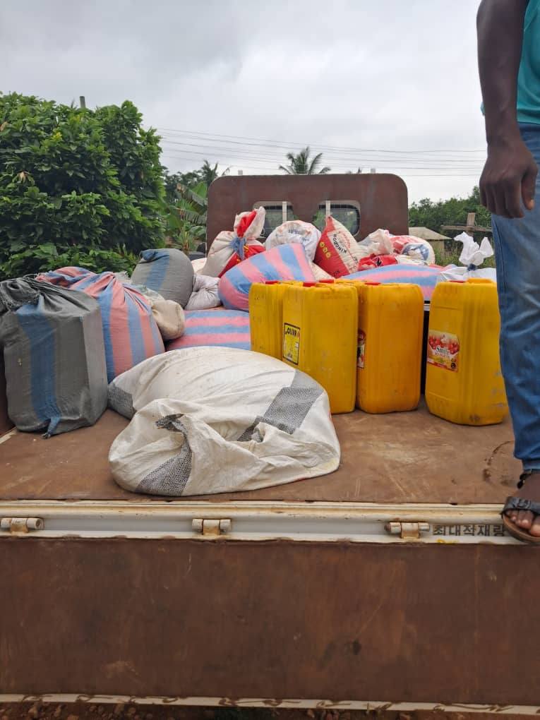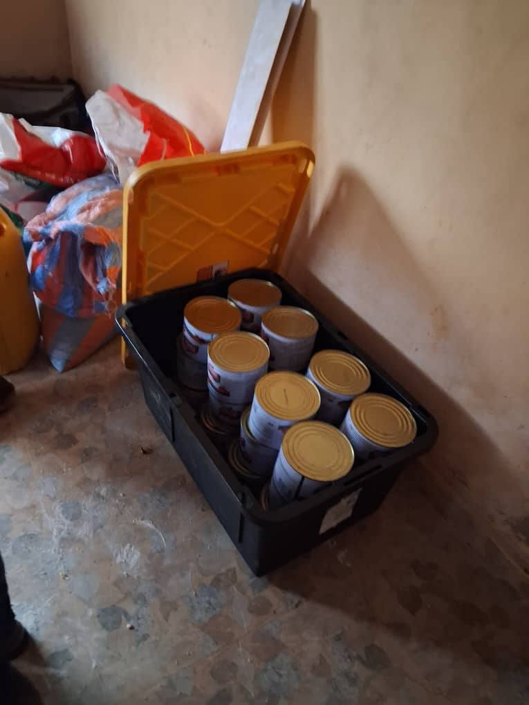 The raid uncovered 21 bags of rice (50kg each), 54 tins of canned mackerel, 40 large tins of tomato paste, 6 gallons of cooking oil, Multiple sacks of gari, maize, millet, beans, sugar, and cartons of milk.