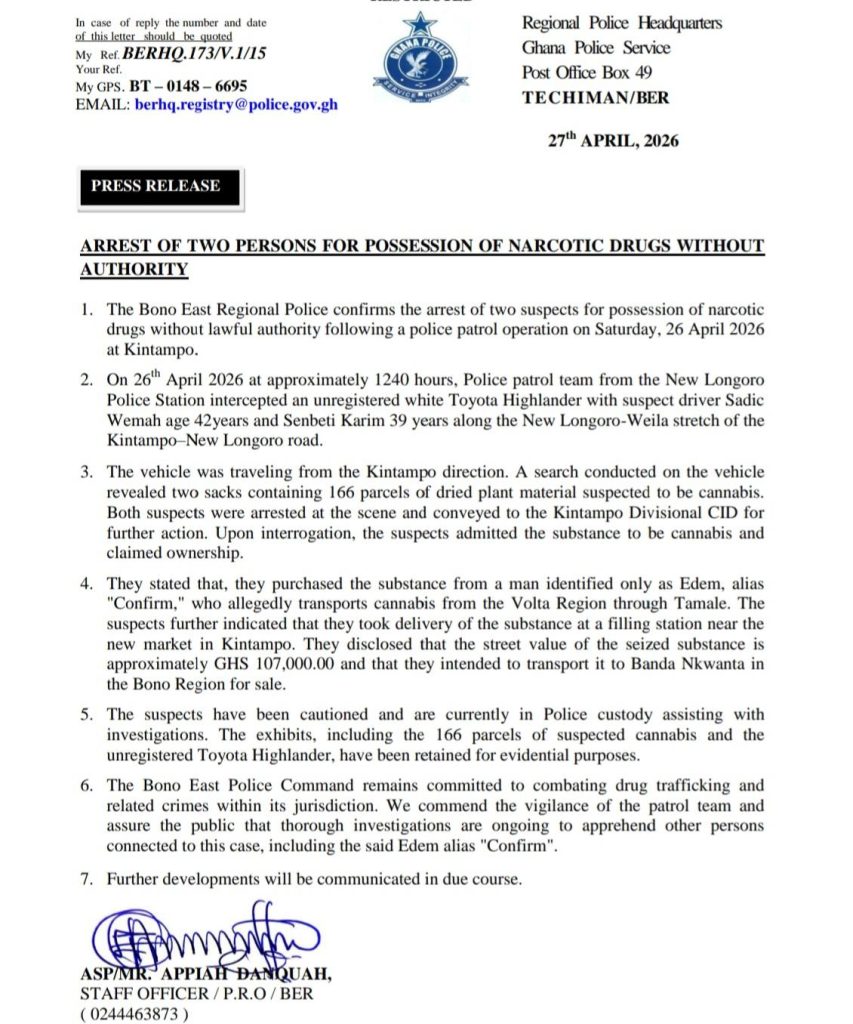 The Bono East Regional Police Command intercepted an unregistered Toyota Highlander transporting 166 parcels of suspected cannabis with an estimated street value of GH¢107,000.