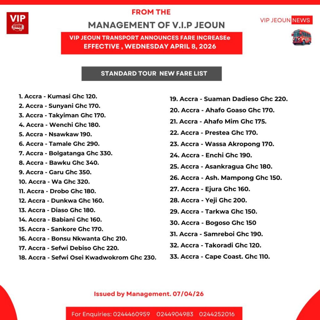 VIP Jeoun Transport has announced a new increment of fares effective tomorrow, Wednesday, April 8, 2026.